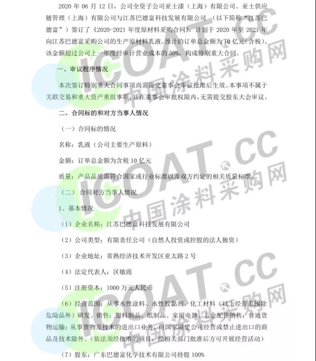 据涂料采购网了解,此次合同标的为乳液(亚士创能主要生产原料),订单总金额为含税10亿元,要求产品品质需符合国家或行业标准以及双方约定的相关质量标准。