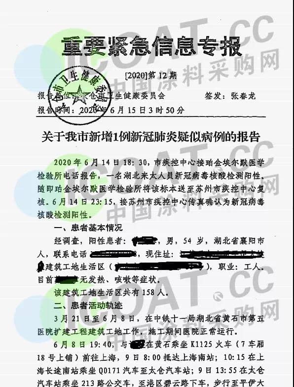 同时,江苏省太仓市卫生健康委员会发布《关于我市新增1例新冠肺炎疑似病例的报告》,2020年6月14日18:30,太仓市疾控中心接珀金埃尔默医学检验所电话报告,一名湖北来太人员新冠病毒核酸检测阳性。该患者系湖北籍途径上海返苏人员,返苏前在湖北中铁十一局一建筑工地工作,目前无感染症状,正在进行进一步医学观察!