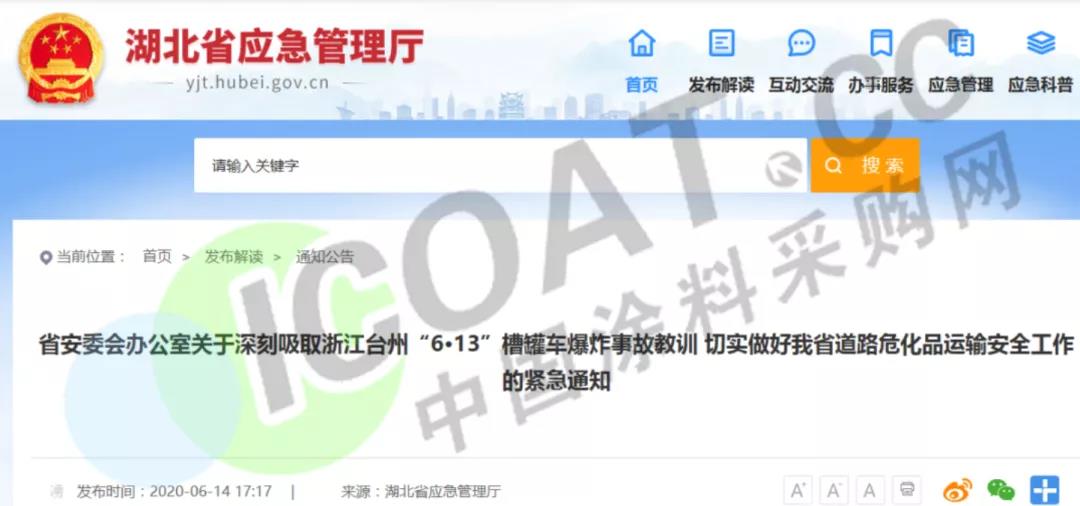 为深刻吸取浙江台州“6·13”槽罐车爆炸事故教训,举一反三,认真做好湖北省道路危化品运输安全工作,6月14日,湖北省安委办印发《关于深刻吸取浙江台州“6·13”槽罐车爆炸事故教训 切实做好我省道路危化品运输安全工作的紧急通知》,主要内容如下: