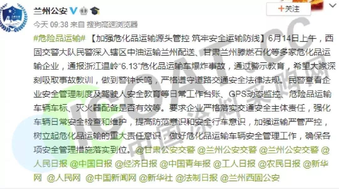 6月14日上午,西固交警大队民警深入辖区中油运输兰州配送、甘肃兰州滕燃石化等多家危化品运输企业,通报浙江温岭“6.13”危化品运输车爆炸事故,通过警示教育,希望大家深刻吸取事故教训,做到警钟长鸣,严格遵守道路交通安全法律法规。民警查看企业安全管理制度及驾驶人安全教育等日常工作台账、GPS动态监控、危险品运输车辆车标、灭火器配备是否有效等。要求企业严格落实交通安全主体责任,强化车辆日常安全检查和维护,提高防范意识和安全行车意识,加强运输严管严控,树立起危化品运输的重大责任意识,做好危化品运输车辆安全管理工作,确保各项安全管理措施落实到位。
