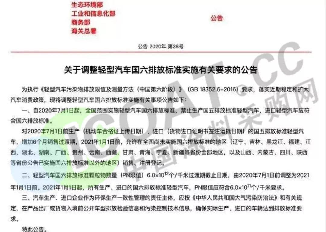 同时,公告表示,轻型汽车国六排放标准颗粒物数量(PN限值)6.0×1012个/千米过渡期截止日期由2020年7月1日前调整为2021年1月1日前。2021年1月1日起,所有生产、进口的国六排放标准轻型汽车,PN限值应符合6.0×1011个/千米要求。