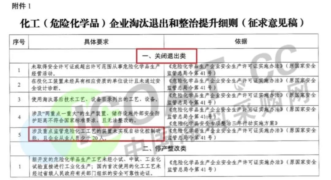 附件1中明确了关闭退出类,停产整改类,限期整改类等三大类别。关闭退出类的危化品/化工企业,包括未取得安全许可证或超出许可范围从事危险化学品生产经营活动;在役化工装置未经具有相应资质的单位设计且未通过安全设计诊断;使用淘汰落后技术工艺、设备目录列出的工艺、设备;涉及“两重点一重大”的生产装置、储存设施外部安全防护距离不符合国家标准要求,且无法整改的;涉及重点监管危险化工工艺的装置未实现自动化控制功能企业从业人员少于20人等。