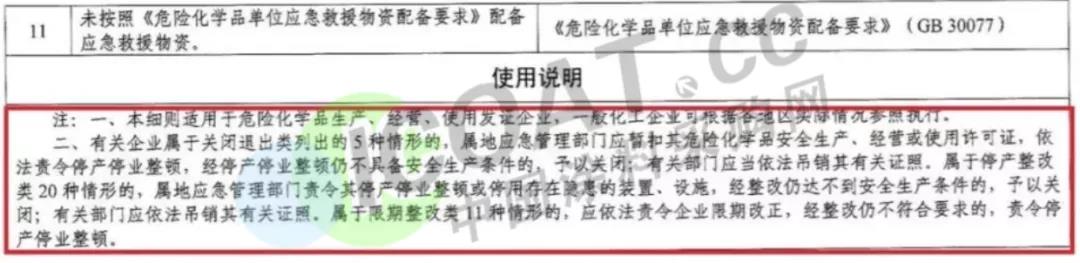该细则适用于危化品生产、经营、使用发证企业等,有关企业属于关闭退出类别的5种情形的,属地应急管理部门应暂扣其危险化学品安全生产、经营或使用许可证,依法责令停产停业整顿,经停产停业整顿仍不具备安全生产条件的,予以关闭;有关部门应当依法吊销其有关证照。属于停产整改类20种情形的,属地应急管理部门责令其停产停业整顿或停用存在隐患的装置、设施。经整改仍达不到安全生产条件的,予以关闭,有关部门应依法吊销其证照,属于限期整改类11种情形的,应依法责令企业限期改正,经整改仍不符合要求的,责令停产停业整顿。