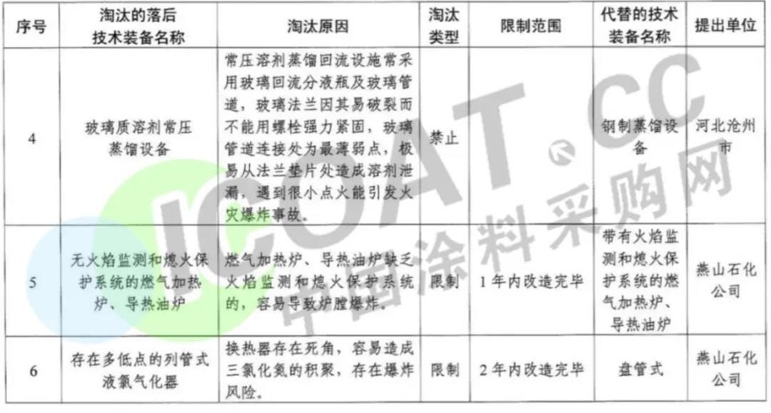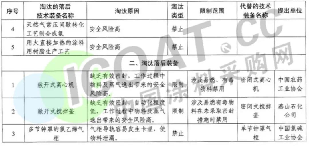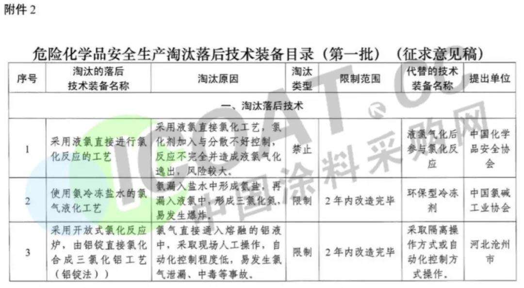 附件2中淘汰落后技术包括,采用液氯直接进行氯化反应的工艺、用火直接加热的涂料用树脂生产工艺等。淘汰落后装备包括,煤制甲醇装置气体净化工序三元换热器(铝制板翅式换热器),多节钟罩的氯乙烯气柜等。淘汰分为限制和禁止两种类型。