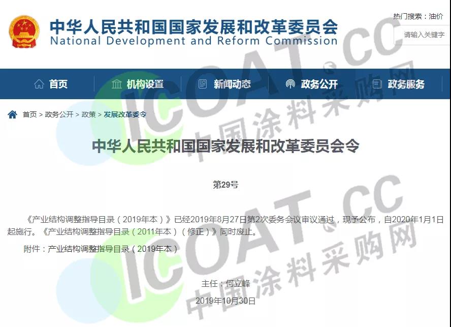 据涂料采购网了解,去年,国家发展改革委修订发布了《产业结构调整指导目录(2019年本)》,自2020年1月1日起施行,并宣称《产业结构调整指导目录(2011年本)(修正)》同时废止。《目录》中对于多个行业产业划分为鼓励类、限制类和淘汰类三个类别,涉及钢铁、涂料、化工等多个行业产业。