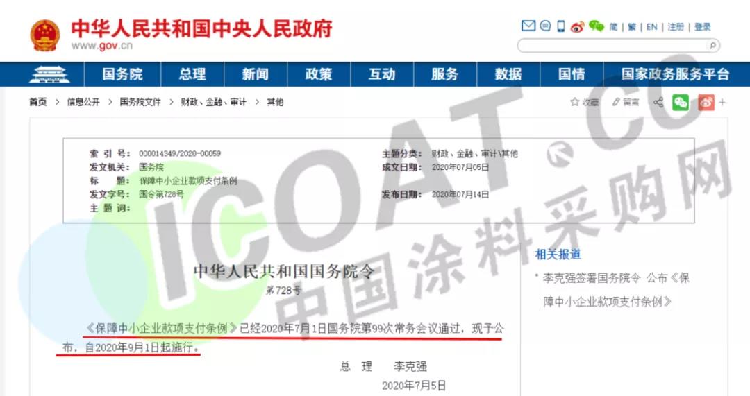 国务院总理日前签署国务院令,公布《保障中小企业款项支付条例》(以下简称《条例》),自2020年9月1日起施行。