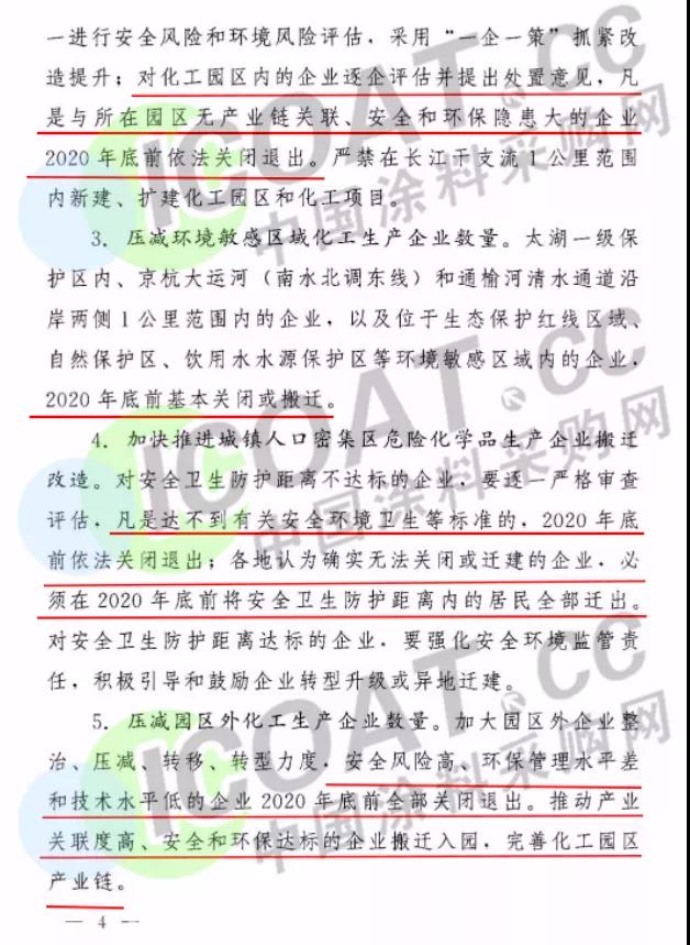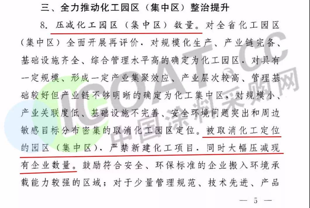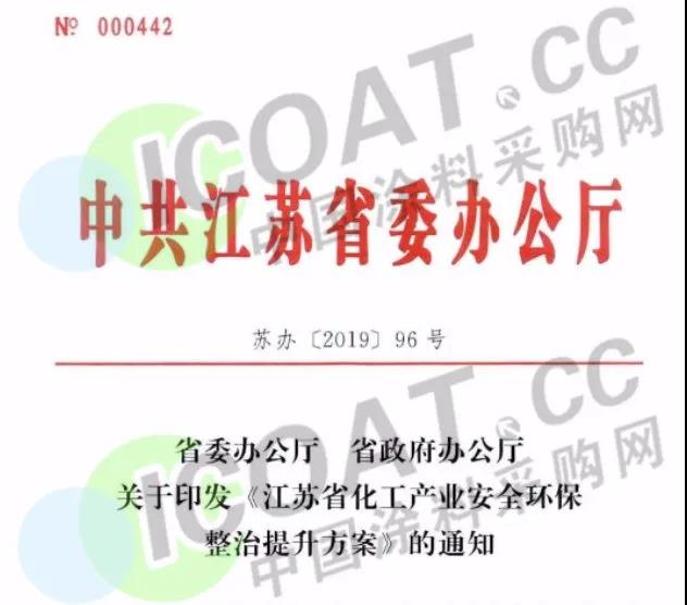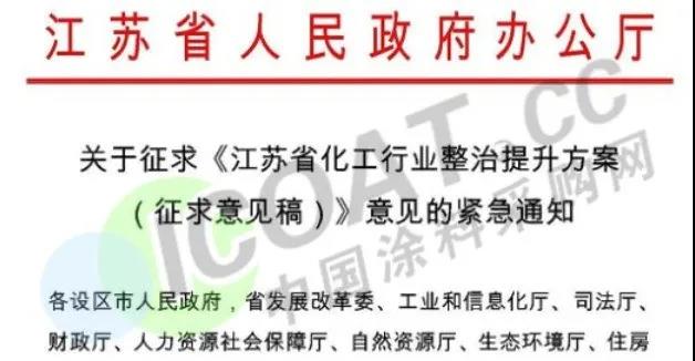 据涂料采购网了解,响水爆炸事故之后,江苏省人民政府办公厅2019年4月1日发布关于征求《江苏省化工行业整治提升方案(征求意见稿)》(以下简称“意见稿”)。对未来五年之内,江苏省化工企业、化工园区的改造升级及退出做出了明确指示。
