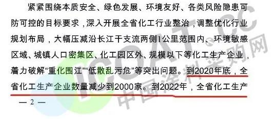 该方案指出,到2020年底,江苏省化工生产企业数量减少到2000家,到2022年,全省化工生产企业数量不超过1000家;沿长江干支流两侧1公里范围内、化工园区外的34家企业原则上2020年底前全部退出;