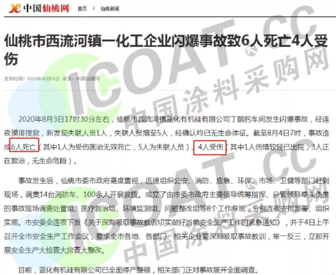 与江苏合义化工新材料公司相比,蓝化有机硅有限公司就没有这么幸运了。在8月3日17时30分左右,湖北省仙桃市西流河镇蓝化有机硅有限公司丁酮肟车间发生闪爆事故,截至8月4日7时,事故造成6人死亡、4人受伤(其中1人伤情较轻已出院,3人正在救治,无生命危险)。目前,蓝化有机硅有限公司已全面停产整顿,相关部门正对事故展开全面调查。