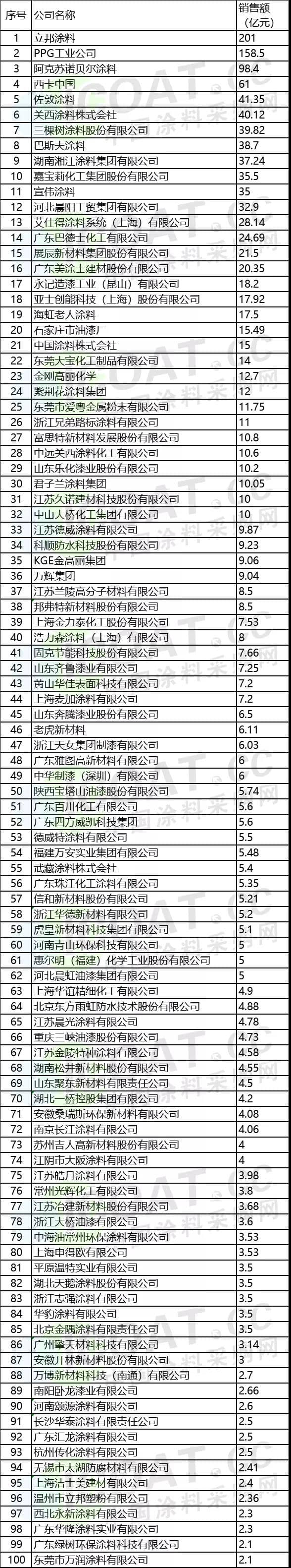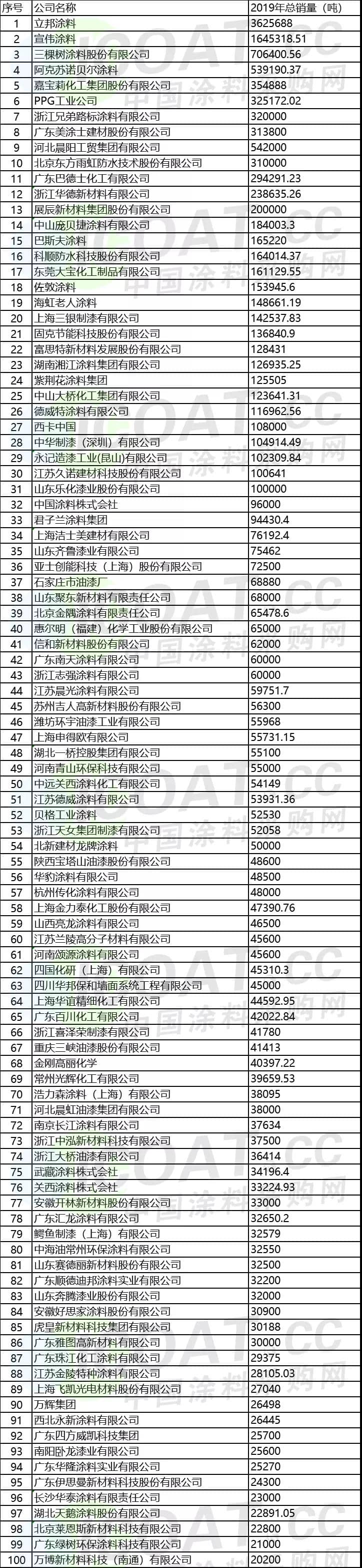 据涂料采购网统计,2020年涂料销售额百强企业的总销售额为1450.73亿,其中,外资企业的销售总额达到769.52亿,占涂料销售额百强企业总销售额的53%。而且从整个百强榜来看,在2020涂料销售额百强榜当中,在前十强当中,仅有三棵树、湖南湘江涂料、嘉宝莉三家民族涂料企业,其他7家企业均为外资涂料企业,立邦涂料居榜首。