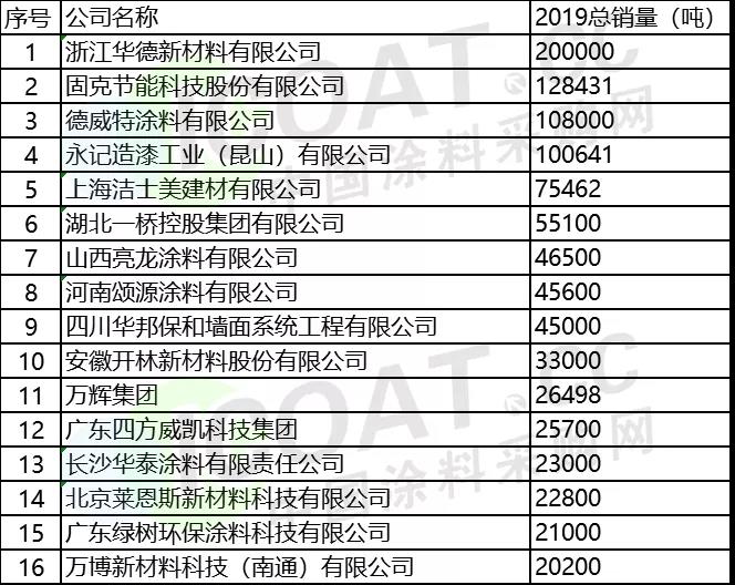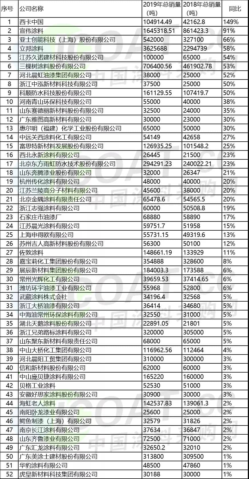 2019年涂料百强企业销量增长前三名西卡、宣伟、亚士创能