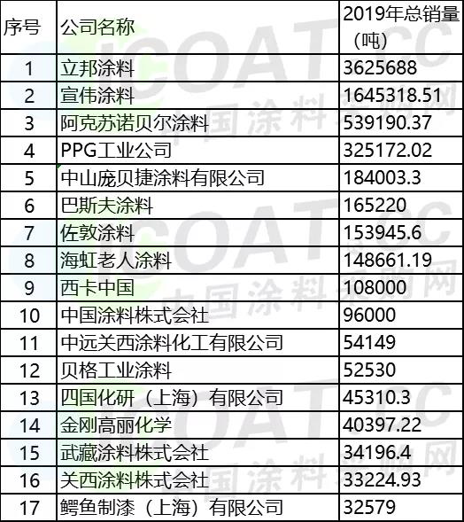较2018年涂料百强榜相比,三棵树涂料成功超越阿克苏诺贝尔涂料,晋级前三甲,这主要得益于2019年三棵树涂料企业在国内的几大涂料生产基地的投产,使得涂料产量有了大幅度的提升。