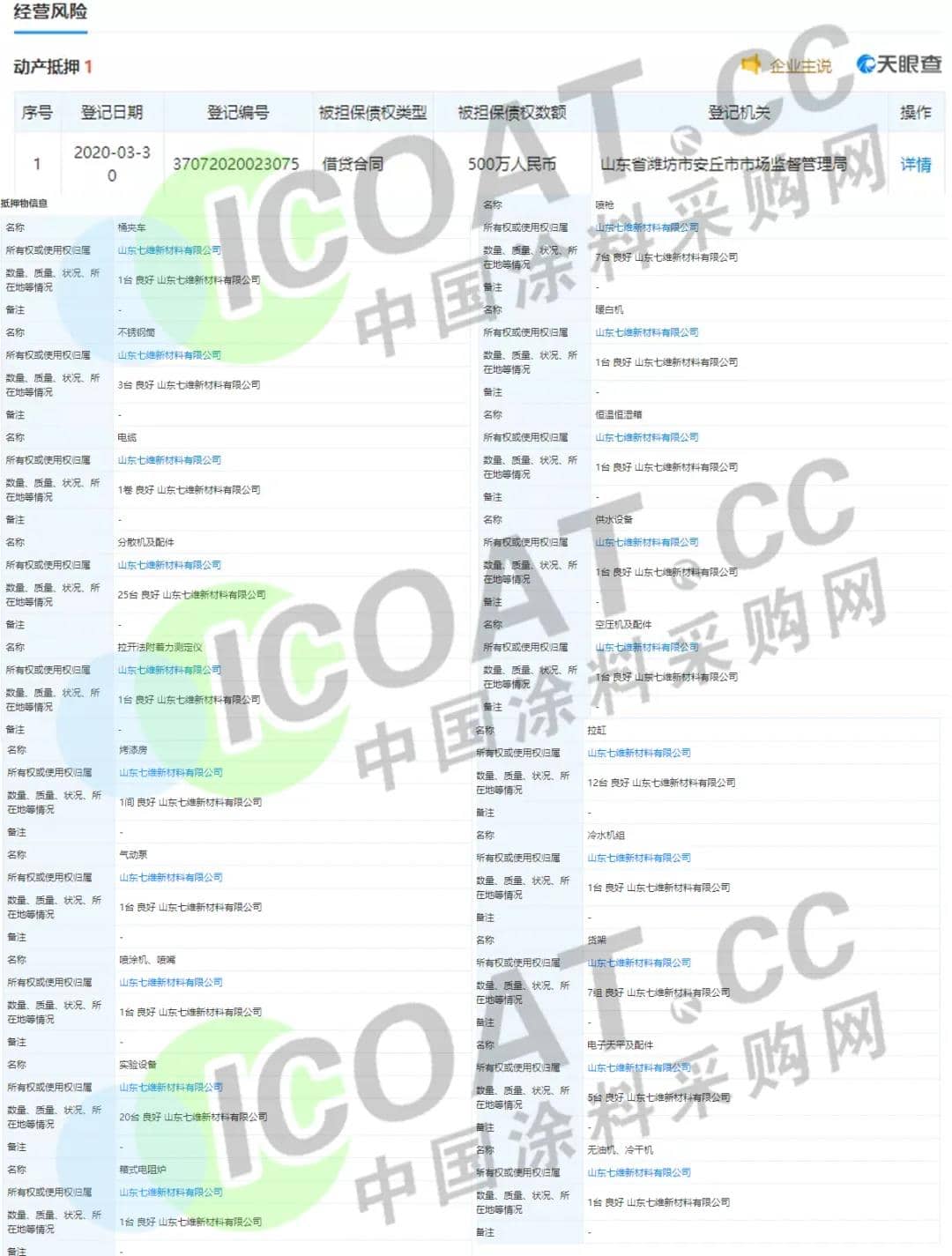 据涂料采购网了解,今年3月30日,七维水漆因为借贷合同,将抵押物以500万元的债权数额抵押给安丘市潍安水务有限公司,抵押物包括不锈钢筒、电缆、分散机及配件、烤漆房、实验设备、喷涂机、喷嘴、拉缸、砂磨机、空压机等多个种类的物品。这不禁让人猜测,是否七维水漆资金链存在断裂风险,才用动产抵押来缓和资金方面的问题。