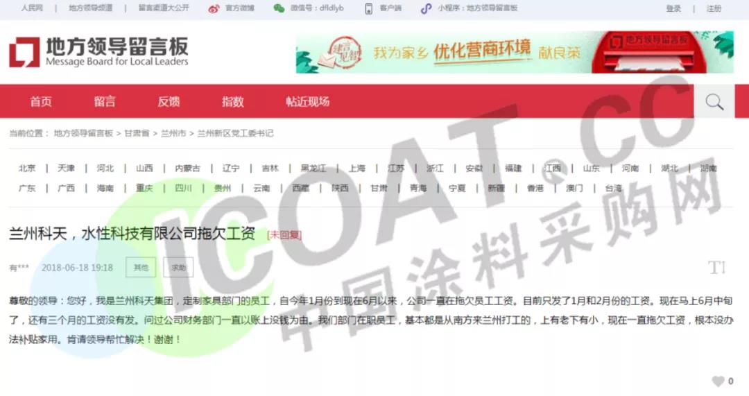 地方领导留言板显示,某兰州科天集团定制家具部门的员工称,兰州科天集团财务部门以账上没钱为由,一直拖欠员工工资,目前他上有老下有小根本无法补贴家用。