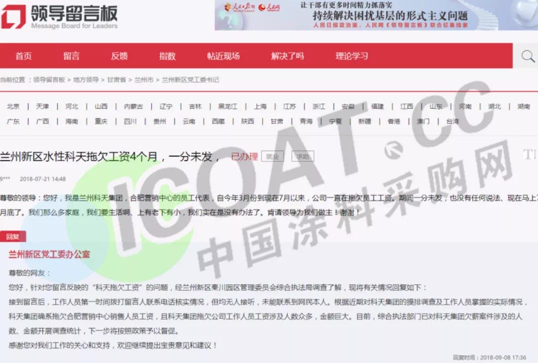 另一兰州科天集团合肥营销中心的员工表示,自3月份至7月份,该企业一直拖欠员工工资,期间一分未发,也没有任何说法。兰州新区党委工位办公室的回复称,科天集团确系拖欠合肥营销中心销售人员工资,且拖欠工作人员工资涉及人数众多,金额巨大。
