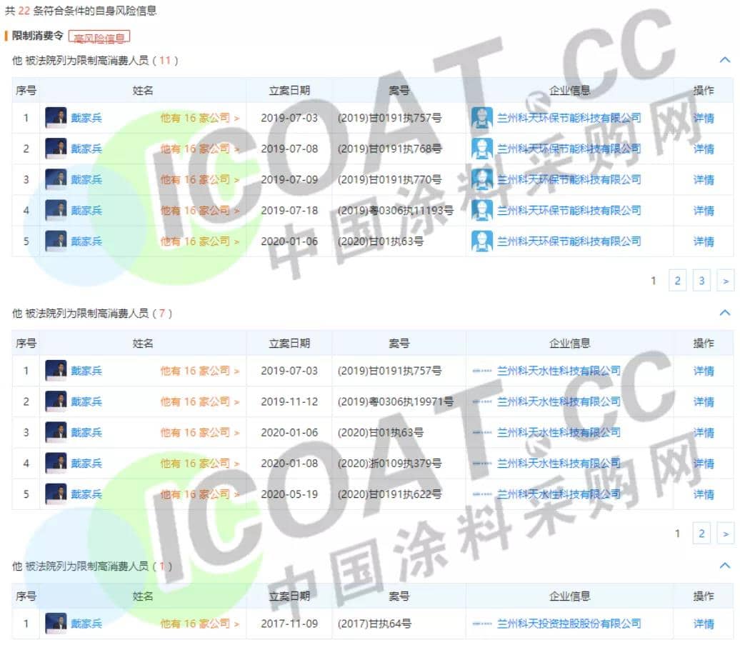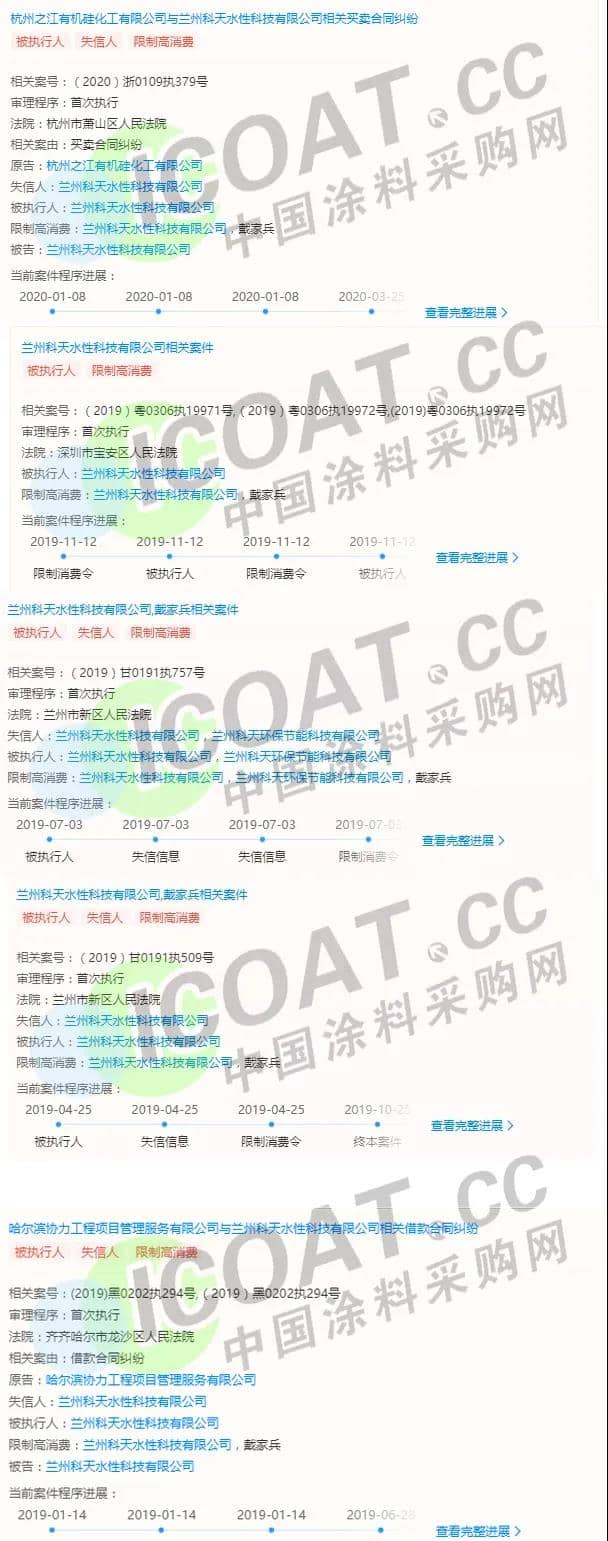 2020年5月19日,兰州新区人民法院对水性科天负责人戴家兵采取了限制消费措施。