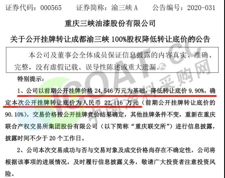 昨日(22日),重庆三峡油漆股份有限公司发布《关于公开挂牌转让成都渝三峡100%股权降低转让底价的公告》,称以前期公开挂牌价格24,546万元为基础,降低转让底价9.90%,确定本次公开挂牌转让底价为人民币22,116万元,比之前的价格整整调低了2430万元,重新在重庆联交所进行信息披露。