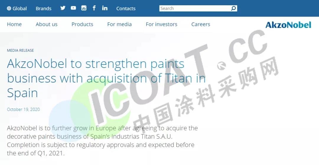 10月19日,西班牙IndustriasTitanS.A.U将装饰涂料业务出售给阿克苏诺贝尔。预计将于2021年第一季度结束前完成。