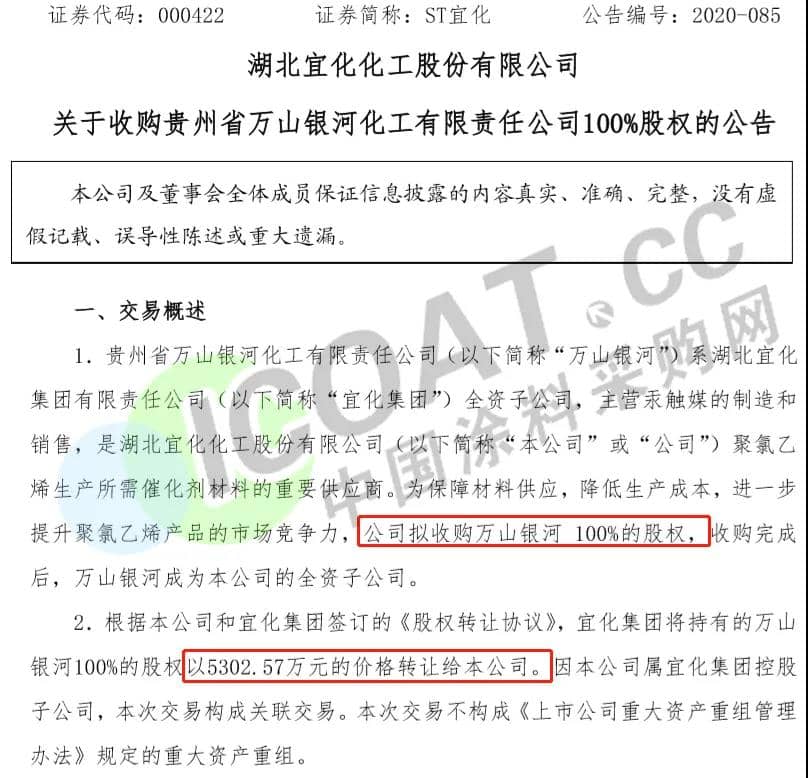 10月16日,万山银河化工有限责任公司将100%的股权出售给ST宜化,交易价款为5302.57万元。