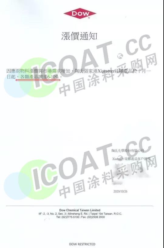 陶氏发布涨价通知,宣布张家港Xiameter硅胶产品于十月一日起,各类产品调涨6-10%。