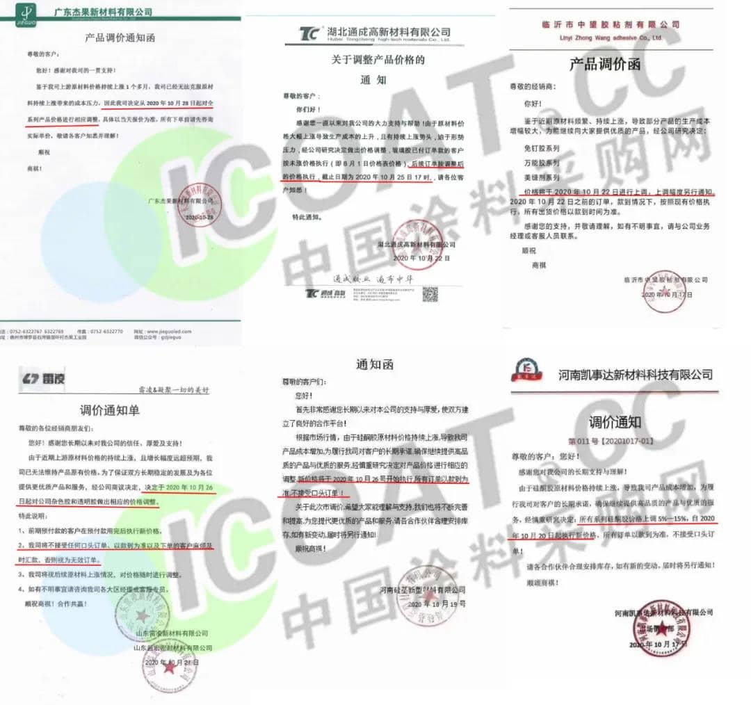 硅酮胶市场几乎到了价格一日一调的地步,企业纷纷宣布,货物上涨5%-20%,订货前先确认最新价格,订单以到款为准,不接受任何口头订单。