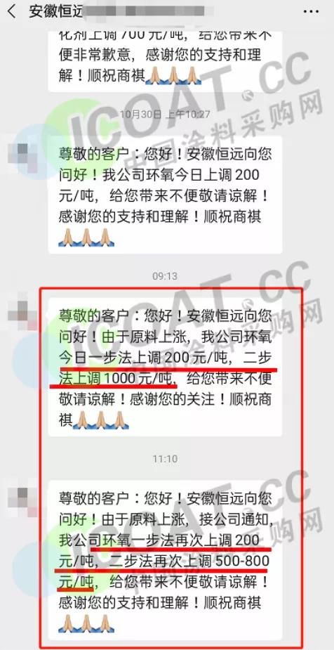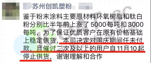 苏州创凯塑粉表示,鉴于与伟德客户端官网主要原材料环氧树脂和钛白粉分别比半年前上涨了5000元/吨和3000元/吨,决定对国庆期间仍未付款,且催讨二次及以上的用户自11月10日起停止供货。