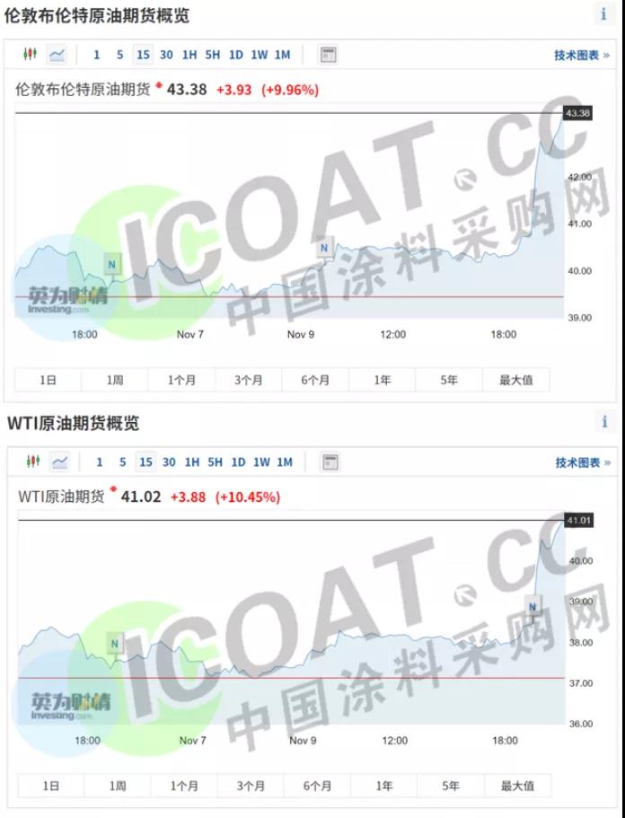 11月9日美布两油均飙升超9%,回升至40美元/桶上方。WTI原油涨幅10.26%,突破40美元关口,报40.19美元/桶。布伦特原油价格涨9.96%,报43.38美元,创今年5月中旬以来最大单日涨幅。