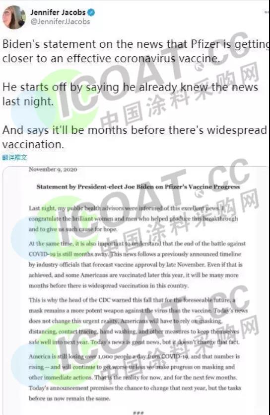 此外,拜登宣布将成立一个由12名顶尖科学家组成的疫情顾问小组,帮助拟定抗疫政策。在8日的演讲中,拜登除了呼吁美国不同种族要更加团结外,还表示上任后首要任务是控制新冠疫情,并任命一个专家团队以制定应对新冠疫情的计划。针对辉瑞的新冠疫苗进展,拜登表示,辉瑞的新冠疫苗进展是极好的消息。