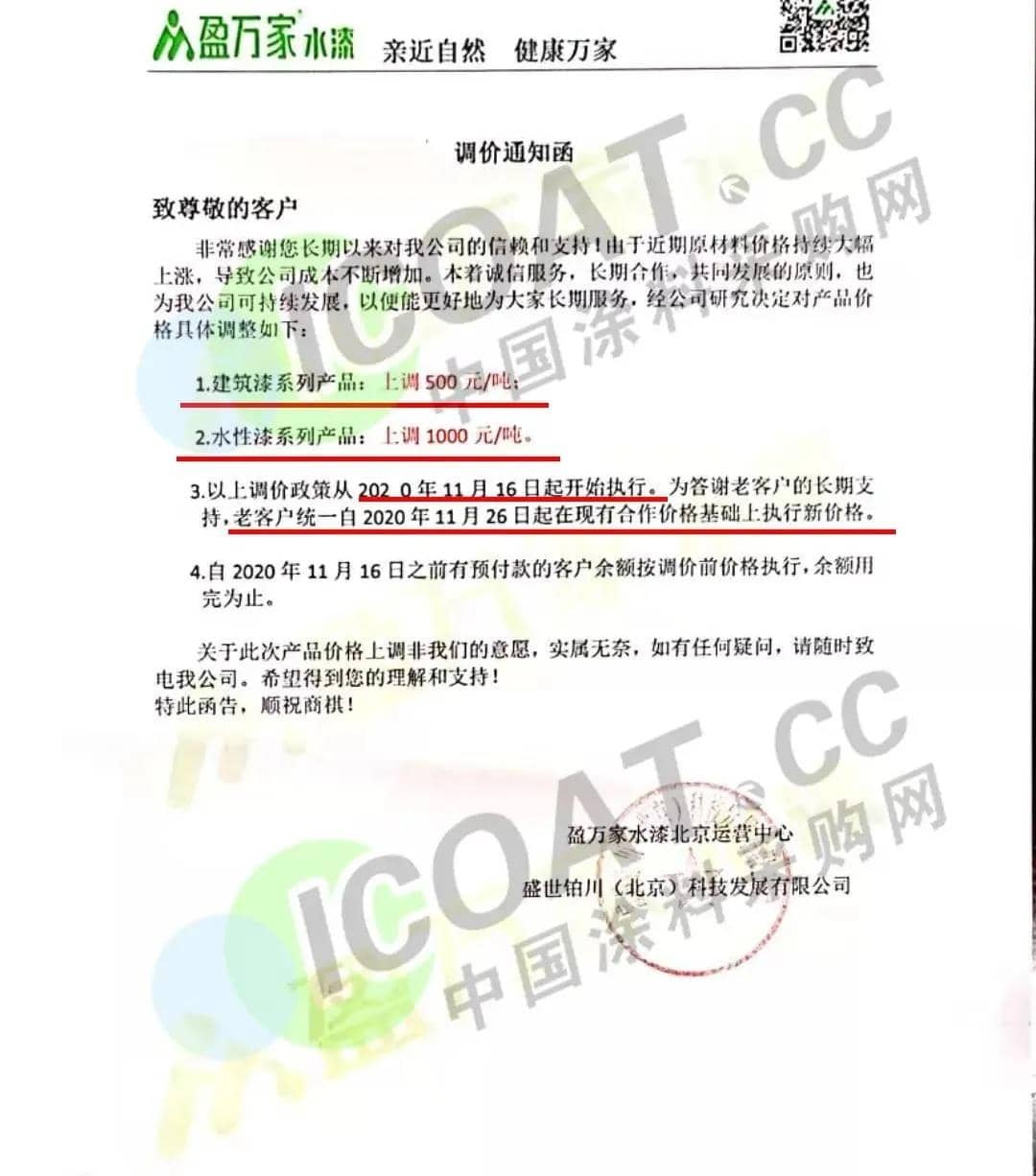 盈万家水漆发函,称建筑漆系列产品上调500元/吨,水性漆系列产品上调1000元/吨。