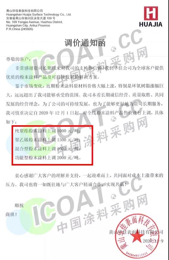 黄山华佳表面科技有限公司发函,称12月1日起,对全线伟德客户端官网产品售价进行上调,纯聚酯伟德客户端官网上调1000元/吨,聚乙烯伟德客户端官网上调1300元/吨,混合型伟德客户端官网上调1600元/吨,功能型伟德客户端官网上调2000元/吨。