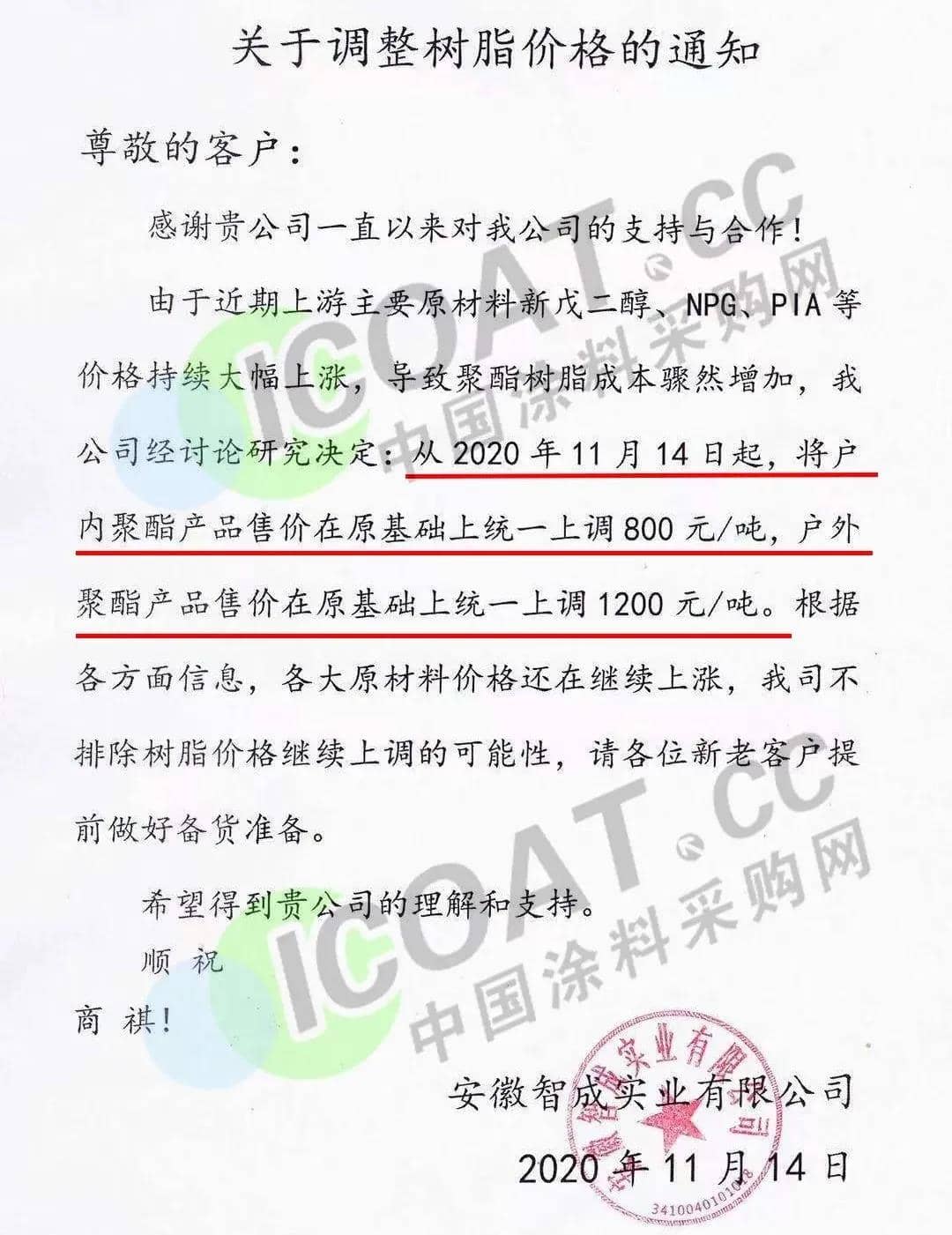 14日,安徽智成实业有限公司发函,称14日起,户内聚酯产品售价在原基础上统一上调800元/吨,户外聚酯产品售价在原基础上统一上调1200元/吨。