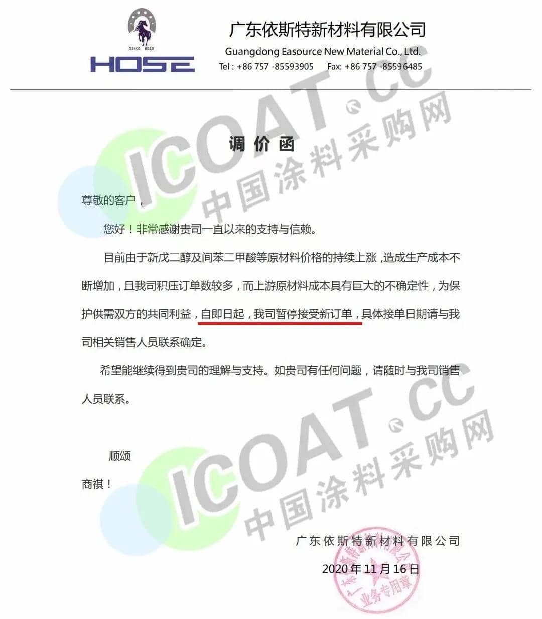 广东依斯特新材料有限公司发函,称即日起,暂停接受新订单,具体接单日期请与相关销售人员联系确定。