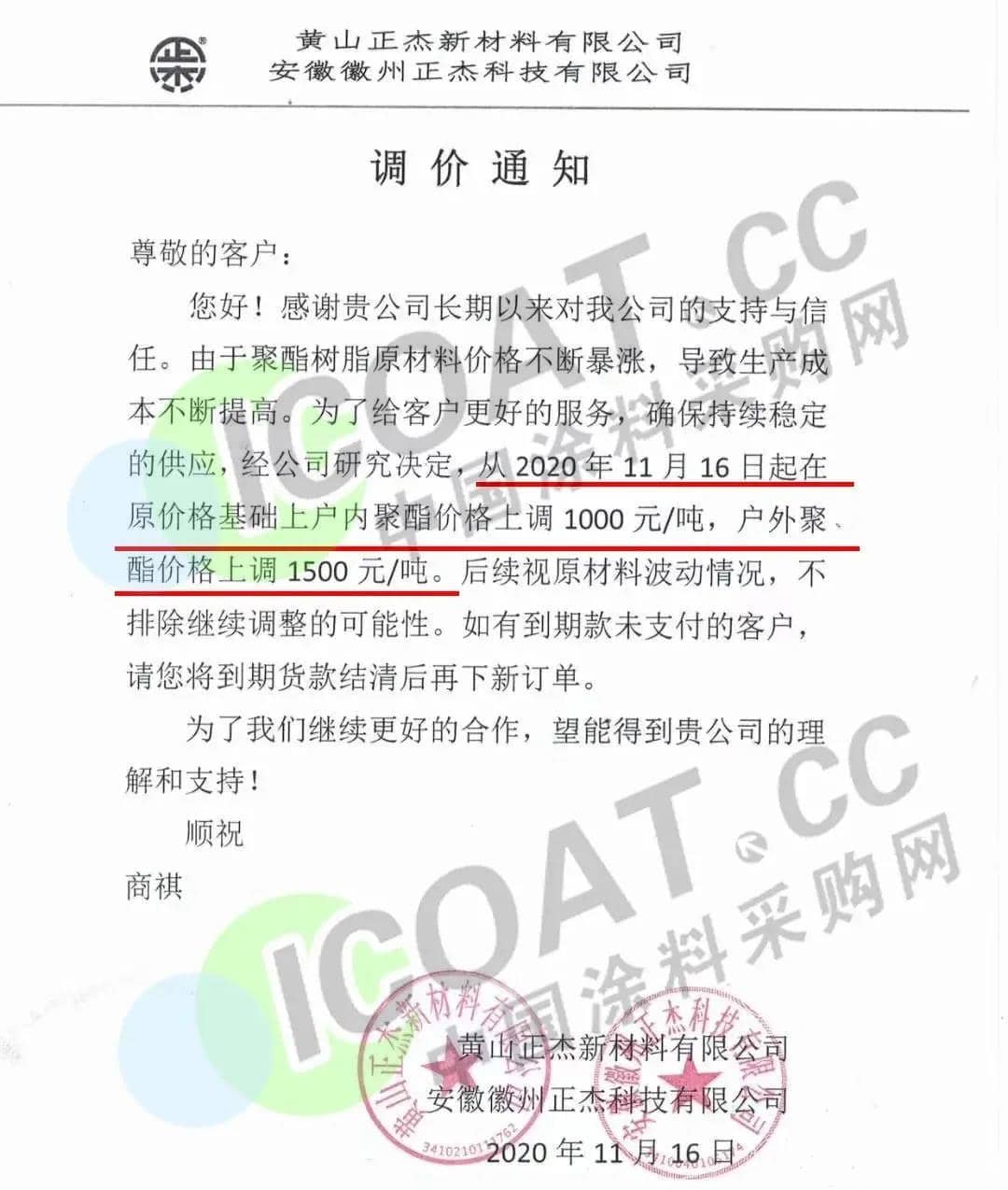 黄山正杰新材料有限公司发函,称16日起,在原价格基础上户内聚酯价格上调1000元/吨,户外聚酯价格上调1500元/吨,后续视原材料波动情况,不排除继续调整的可能性。