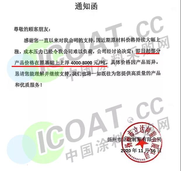 扬州市立达树脂有限公司发函称即日起部分产品在原价格基础上上浮4000-8000元/吨。