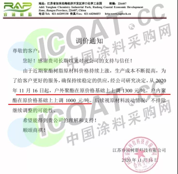 江苏睿浦树脂科技有限公司发函,称16日起,户外聚酯在原价格基础上上调1300元/吨,户内聚酯在原价格基础上上调1000元/吨。