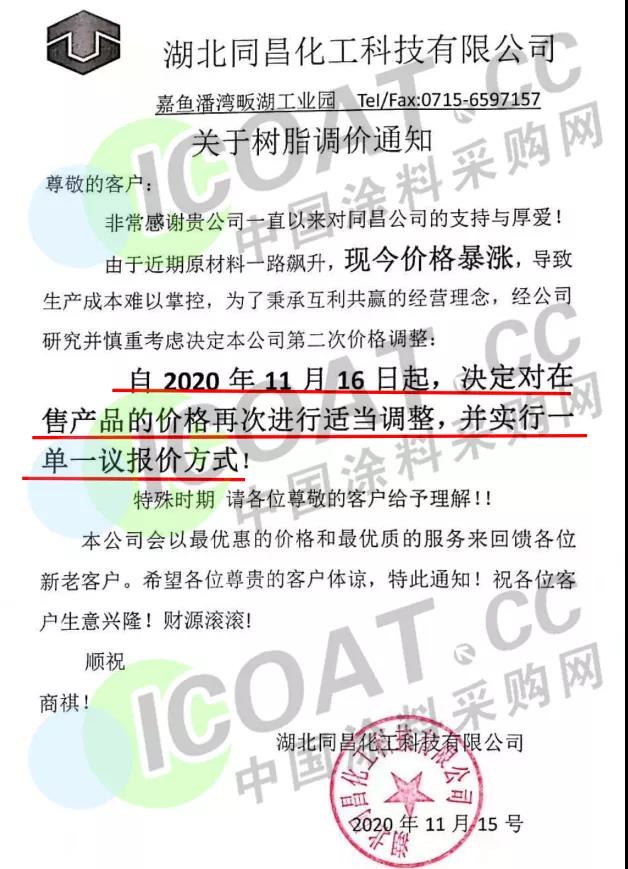 湖北同昌化工科技有限公司发布关于树脂调价的通知,称16日起,决定对在售产品的价格再次进行适当调整,并实行一单一议报价方式。