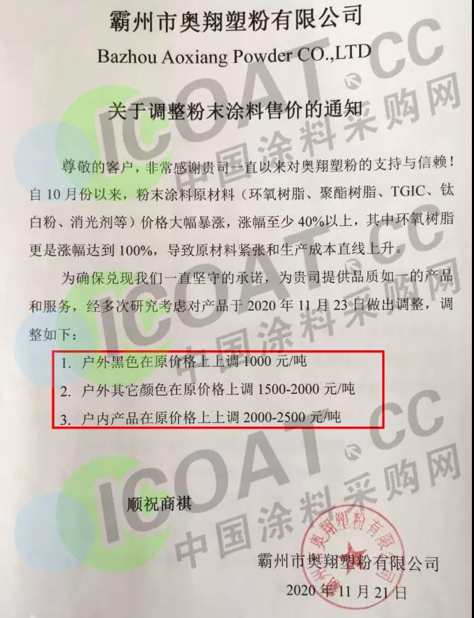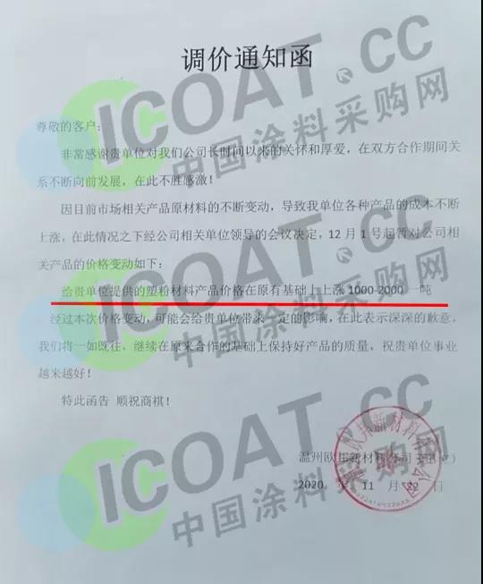 22日,温州欧邦新材料有限公司发函,称塑粉材料产品价格在原有基础上上涨1000-2000元/吨。
