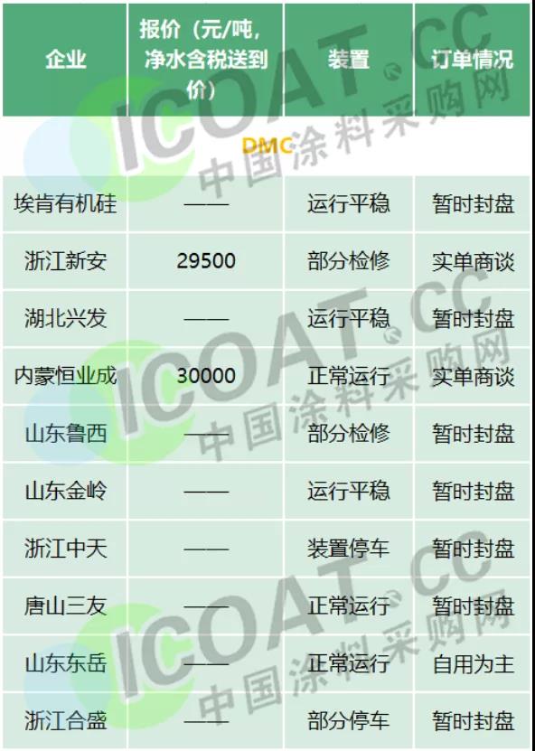 以DMC为例,目前迪肯有机硅、湖北兴发、山东鲁西、山东金岭、浙江中天、唐山三友、浙江合盛等企业暂时封盘,山东东岳自用为主,浙江新安、内蒙恒业成均实单商谈,内蒙恒业成报价已达30000元/吨。