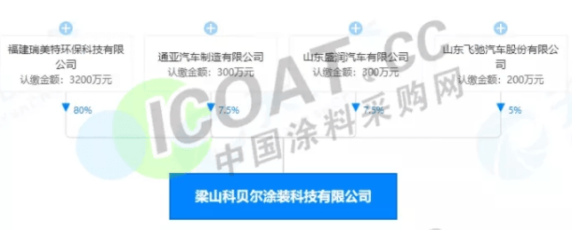 据公开资料,梁山科贝尔涂装科技有限公司位于山东省济宁市梁山县,经营范围包括涂装服务;环保技术以及涂装技术的咨询和服务;新能源、新材料(不含危险化学品)销售与技术咨询。其股东包括福建瑞美特环保科技有限公司、通亚汽车制造有限公司、山东盛润汽车有限公司、山东飞驰汽车股份有限公司等4家企业。