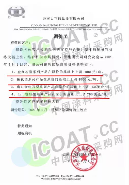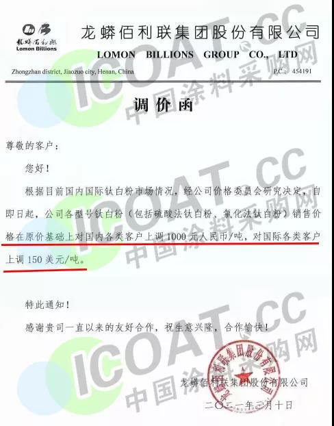 龙蟒佰利:各型号钛白粉对国内各类客户上调1000元/吨,国际各类客户上调150美元/吨。
