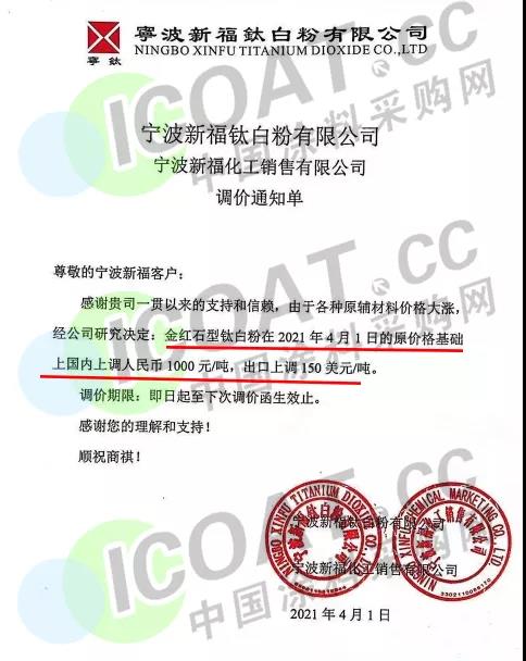 宁波新福钛白粉有限公司发布涨价通知称:自4月1日起,金红石型钛白粉在原价基础上上调1000元/吨,出口价上调150美元/吨。