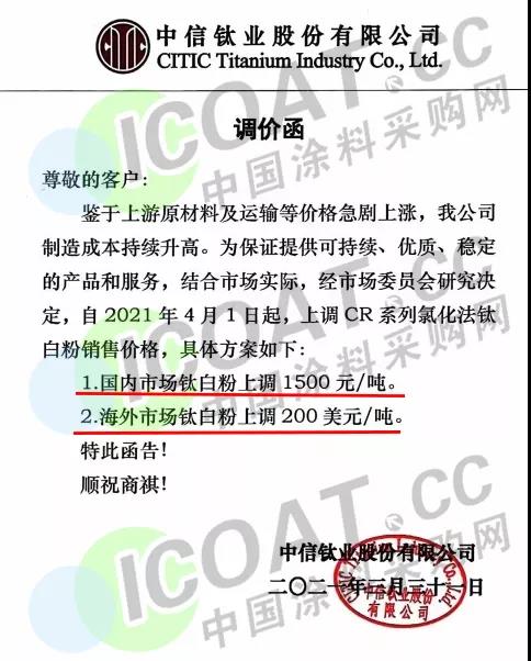 中信钛业:4月1日起,国内钛白粉上调1500元/吨,海外钛白粉上调200美元/吨。