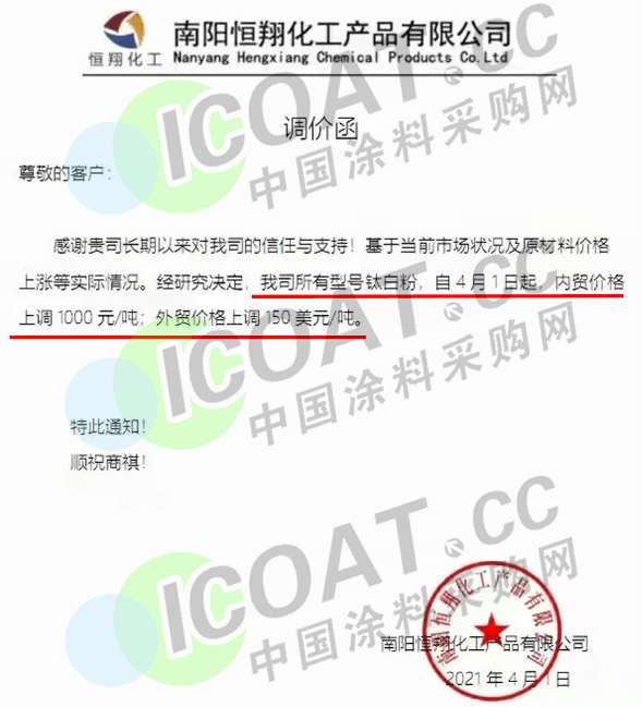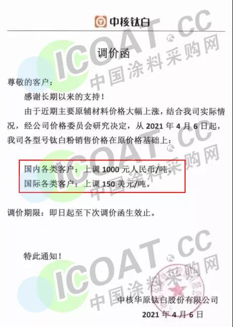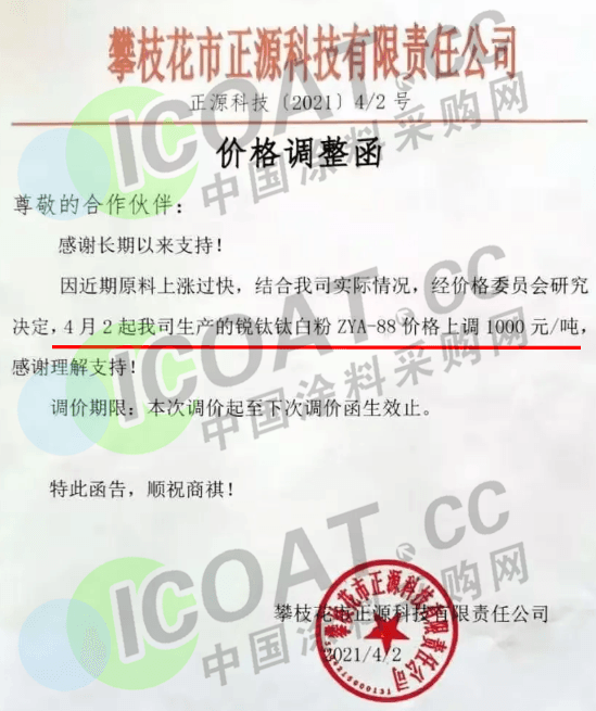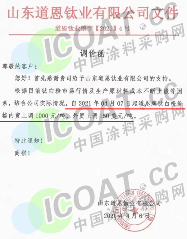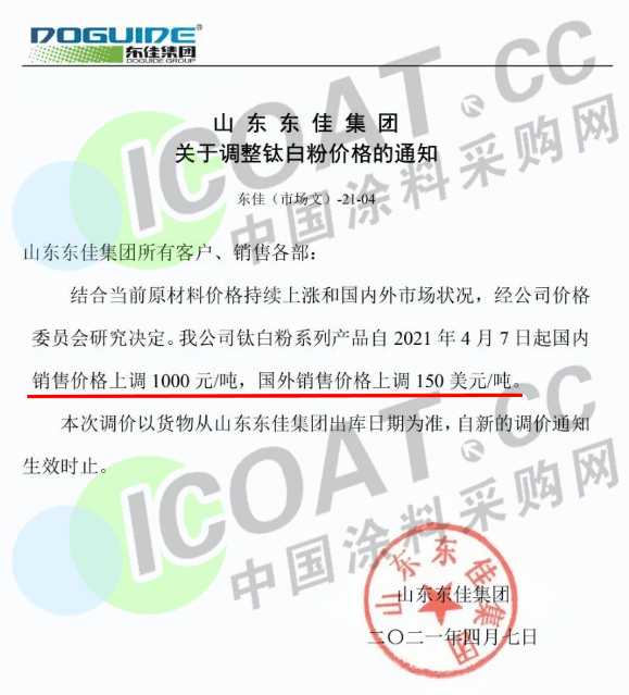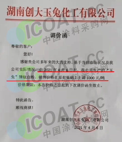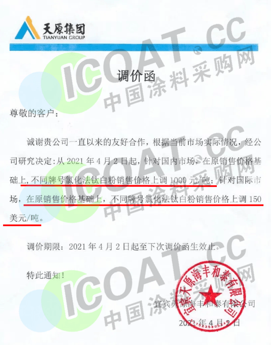 天原集团:从2021年4月2日起,针对国内市场,在原销售价格基础上,不同牌号氯化法钛白粉销售价格上调1000元/吨;针对国际市场,在原销售价格基础上,不同牌号氯化法钛白粉销售价格上调150美元/吨。