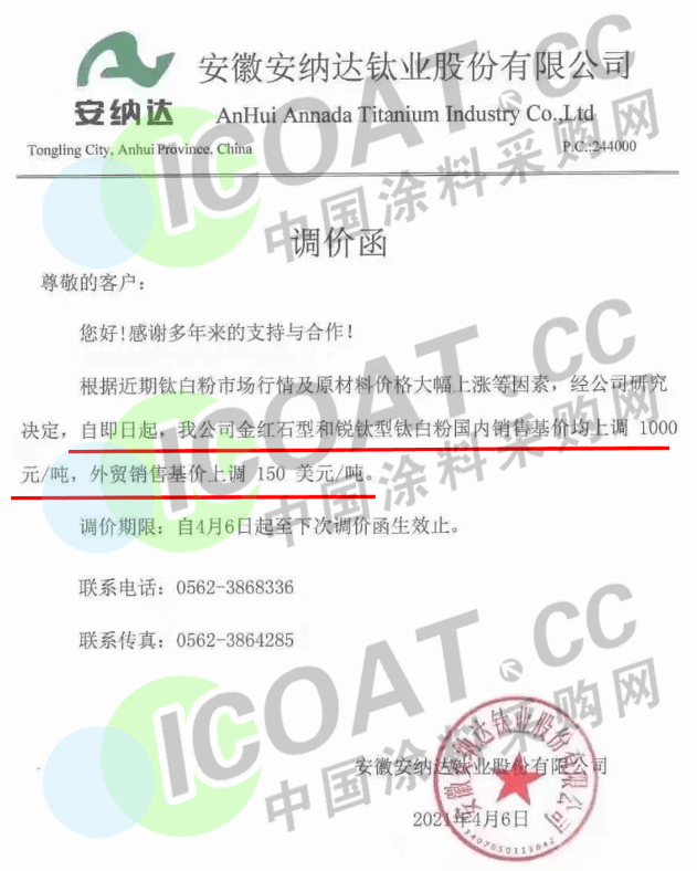 安纳达:即日(6日)起,金红石型和锐钛型钛白粉国内基价均上调1000元/吨,外贸销售价格上调150美元/吨。
