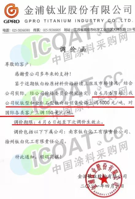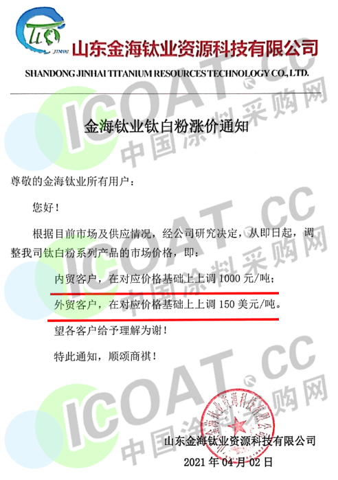 金海钛业:从即日(2日)起调整钛白粉系列产品的市场价格,即内贸客户,在对应价格基础上上调1000元/吨;外贸客户,在对应价格基础上上调150美元/吨。