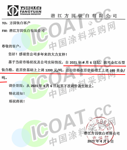 潜江方圆:自2021年4月6日起,金红石型钛白粉在原价基础上上调1200元/吨,出口价格在原价基础上上调180美元/吨。