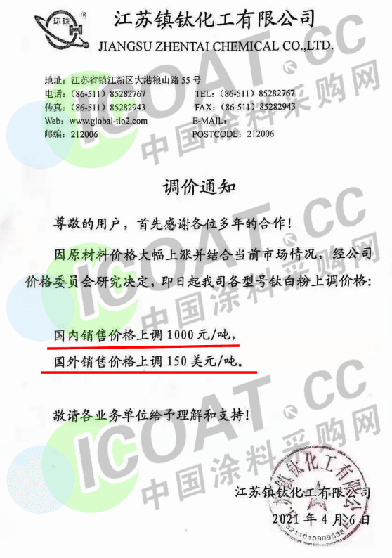 江苏镇钛:即日(6日)起各型号钛白粉上调价格,国内销售价格上调1000元/吨,国外销售价格上调150美元/吨。