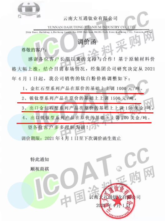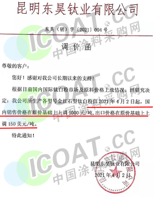 昆明东昊钛业:自2021年4月2日起,国内销售在原价基础上上调1000元/吨,出口价格上调150美元/吨。