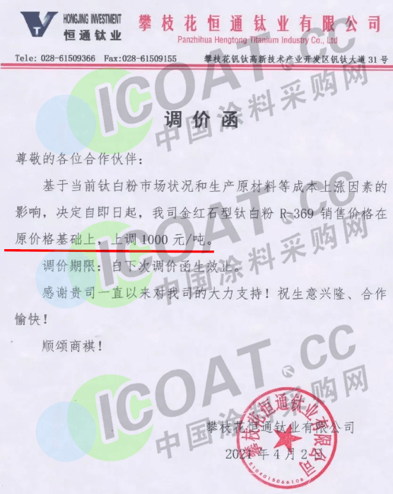 攀枝花恒通钛业:自即日(2日)起,金红石型钛白粉R-369销售价格在原价格基础上上调1000元/吨。
