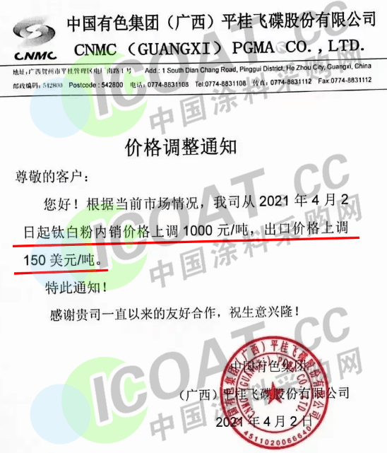 平桂飞碟:从2021年4月2日起,钛白粉内销价格上调1000元/吨,出口价格上调150美元/吨。